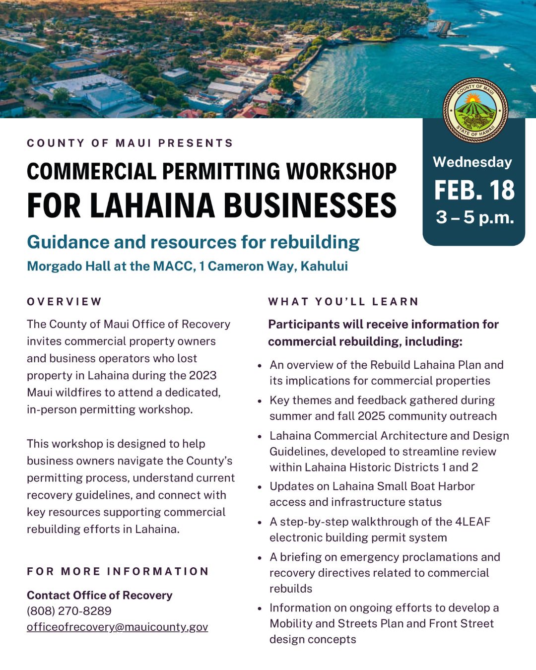 Due to weather complications, the Tuesday, Feb. 10, 2026 Lahaina Commercial Permitting Workshop has been rescheduled to Wednesday, Feb. 18.